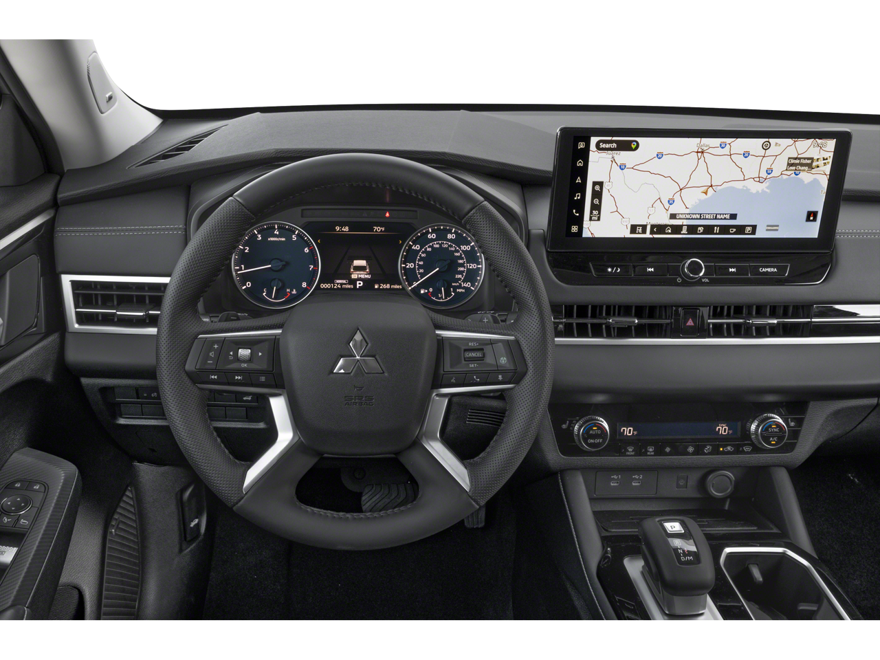 Below is all the standard equipment 4WD, 3rd row seats: split-bench, 4-Wheel Disc Brakes, 8 Speakers, ABS brakes, Air Conditioning, Alloy wheels, AM/FM radio: SiriusXM, Android Auto & Apple CarPlay, Auto High-beam Headlights, Auto-dimming Rear-View mirror, Automatic temperature control, Brake assist, Bumpers: body-color, Driver door bin, Driver vanity mirror, Dual front impact airbags, Dual front side impact airbags, Electronic Stability Control, Emergency communication system: Mitsubishi Connect w/ 24-month trial, Exterior Parking Camera Rear, Four wheel independent suspension, Front anti-roll bar, Front Bucket Seats, Front Center Armrest w/Storage, Front dual zone A/C, Front fog lights, Front reading lights, Fully automatic headlights, Garage door transmitter: HomeLink, Headlight cleaning, Heated door mirrors, Heated Front Bucket Seats, Heated front seats, Illuminated entry, Knee airbag, Leather Shift Knob, Leather steering wheel, Low tire pressure warning, Navigation System, Occupant sensing airbag, Outside temperature display, Overhead airbag, Overhead console, Panic alarm, Passenger door bin, Passenger vanity mirror, Power door mirrors, Power driver seat, Power Liftgate, Power steering, Power windows, Radio data system, Radio: AM/FM 12.3" Navigation w/Smartphone-Link, Rain sensing wipers, Rear anti-roll bar, Rear seat center armrest, Rear side impact airbag, Rear window defroster, Rear window wiper, Reclining 3rd row seat, Remote keyless entry, Security system, Speed control, Speed-Sensitive Wipers, Split folding rear seat, Spoiler, Steering wheel mounted audio controls, Synthetic Leather Seating Surfaces, Tachometer, Telescoping steering wheel, Tilt steering wheel, Traction control, Trip computer, Turn signal indicator mirrors, and Variably intermittent wipers.