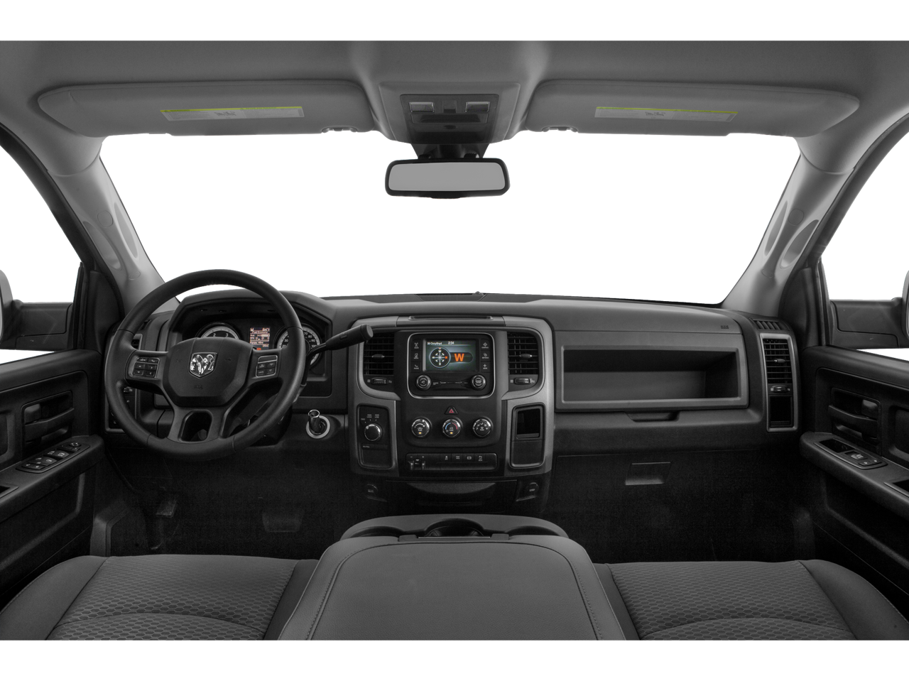 Below is all the standard equipment Heavy Duty Snow Plow Prep Group, Popular Equipment Group (1-Yr SiriusXM Radio Service, 40/20/40 Split Bench Seat, Carpet Floor Covering, Cloth 40/20/40 Bench Seat, For More Info, Call 800-643-2112, Front & Rear Floor Mats, Rear Folding Seat, Remote Keyless Entry, and SiriusXM Satellite Radio), Quick Order Package 22A Tradesman (Front Armrest w/Cupholders), 220 Amp Alternator, 3.73 Rear Axle Ratio, 4-Wheel Disc Brakes, 5.0 Touchscreen Display, 6 Speakers, ABS brakes, Air Conditioning, AM/FM radio, Black Exterior Mirrors, Brake assist, Charge Only Remote USB Port, Clearance Lamps, Continental Radio Manufacturer, Delay-off headlights, Driver door bin, Dual front impact airbags, Dual front side impact airbags, Electric Shift-On-The-Fly Transfer Case, Electronic Stability Control, Electronically Controlled Throttle, Exterior Mirrors w/Heating Element, Front anti-roll bar, Front Bumper Sight Shields, Front Center Armrest, Fully automatic headlights, GPS Antenna Input, Heated door mirrors, Heavy Duty Vinyl 40/20/40 Split Bench Seat, Hemi Badge, Integrated Voice Command w/Bluetooth®, Locking Tailgate, Low tire pressure warning, Manufacturer's Statement of Origin, Media Hub (USB, AUX), Next Generation Engine Controller, Occupant sensing airbag, Overhead airbag, Overhead Console, ParkSense Rear Park Assist System, ParkView Rear Back-Up Camera, Passenger door bin, Power door mirrors, Power steering, Power windows, Radio data system, Radio: Uconnect 3.0 AM/FM, Radio: Uconnect 5.0 AM/FM/BT, Rear seat center armrest, Rear step bumper, Rear View Auto Dim Mirror w/Display, Rear View Mirror w/Microphone, Rear Wheel Spats, Speed control, Storage Tray, Tachometer, Temperature & Compass Gauge, Tilt steering wheel, Tip Start, Traction control, Trailer Brake Control, Transmission Oil Cooler, Variably intermittent wipers, Vendor Painted Cargo Box Tracking, Voltmeter, and Wheels: 18 x 8.0 Steel.