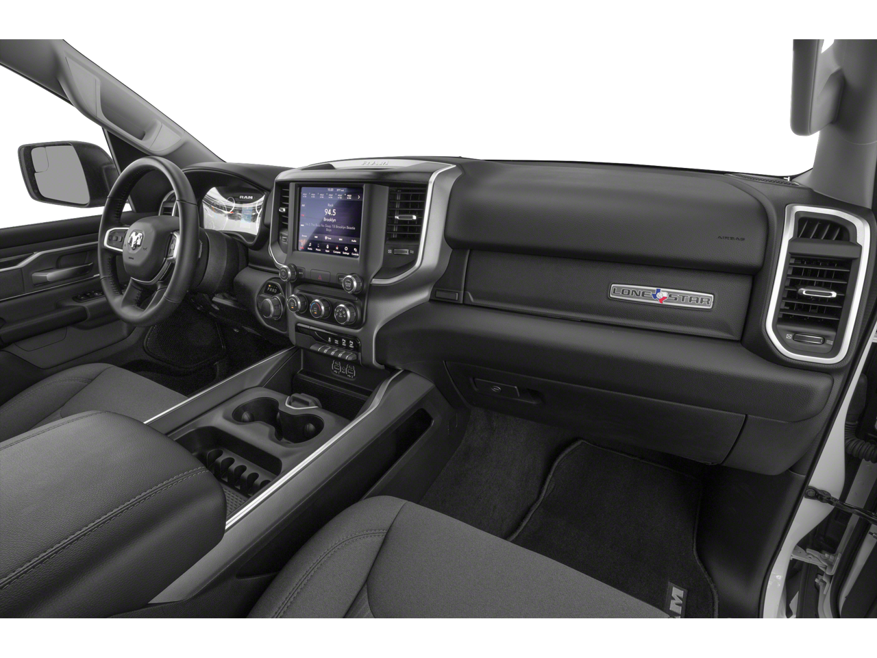 Below is all the standard equipment Bed Utility Group (4 Adjustable Cargo Tie-Down Hooks, Pick-Up Box Lighting, and Spray In Bedliner), Big Horn Level 2 Equipment Group (115V Auxiliary Power Outlet, 115V Auxiliary Rear Power Outlet, 2 USB Full Function/Charge Only Media Hub, 400W Inverter, 8.4 Touchscreen Display, Air Conditioning ATC w/Dual Zone Control, Auto-Dimming Rear-View Mirror, Big Horn IP Badge, Class IV Receiver Hitch, Cluster 7.0 TFT Color Display, Dampened Tailgate, Foam Bottle Insert (Door Trim Panel), Glove Box Lamp, Heated Front Seats, Heated Steering Wheel, Integrated Center Stack Radio, ParkSense Front/Rear Park Assist w/Stop, Power 4-Way Driver Lumbar Adjust, Power 8-Way Driver Seat, Power Adjustable Pedals, Power Heated Fold Away Mirrors, Radio: Uconnect 4 w/8.4 Display, Rear Dome w/On/Off Switch Lamp, Rear Power Sliding Window, Rear Window Defroster, Remote Start System, Security Alarm, Single Disc Remote CD Player, SiriusXM Satellite Radio, Sun Visors w/Illuminated Vanity Mirrors, and Universal Garage Door Opener), Quick Order Package 25Z Big Horn/Lone Star (Steering Wheel Mounted Audio Controls), Wheels: 20 x 9 Aluminum Chrome Clad, 3 Rear Seat Head Restraints, 3.21 Rear Axle Ratio, 4 Way Front Headrests, 4-Wheel Disc Brakes, 48V Belt Starter Generator, 6 Speakers, ABS brakes, Air Conditioning, Alloy wheels, AM/FM radio, Brake assist, Bumpers: chrome, Cloth Bench Seat, Compass, Delay-off headlights, Driver door bin, Dual front impact airbags, Dual front side impact airbags, Electronic Stability Control, Front anti-roll bar, Front Center Armrest w/Storage, Front fog lights, Front reading lights, Front Seat Back Map Pockets, Front wheel independent suspension, Fully automatic headlights, GPS Antenna Input, Heated door mirrors, Illuminated entry, Leather steering wheel, Low tire pressure warning, Occupant sensing airbag, Outside temperature display, Overhead airbag, Overhead console, Panic alarm, ParkView Rear Back-Up Camera, Passenger door bin, Passenger vanity mirror, Power door mirrors, Power steering, Power windows, Radio data system, Radio: Uconnect 3 w/5 Display, Rear 60/40 Folding Seat, Rear anti-roll bar, Rear seat center armrest, Rear step bumper, Remote keyless entry, Speed control, Split folding rear seat, Tachometer, Telescoping steering wheel, Tilt steering wheel, Traction control, Trip computer, Variably intermittent wipers, Voltmeter, Wheel to Wheel Side Steps, and Wheels: 18 x 8 Awards: