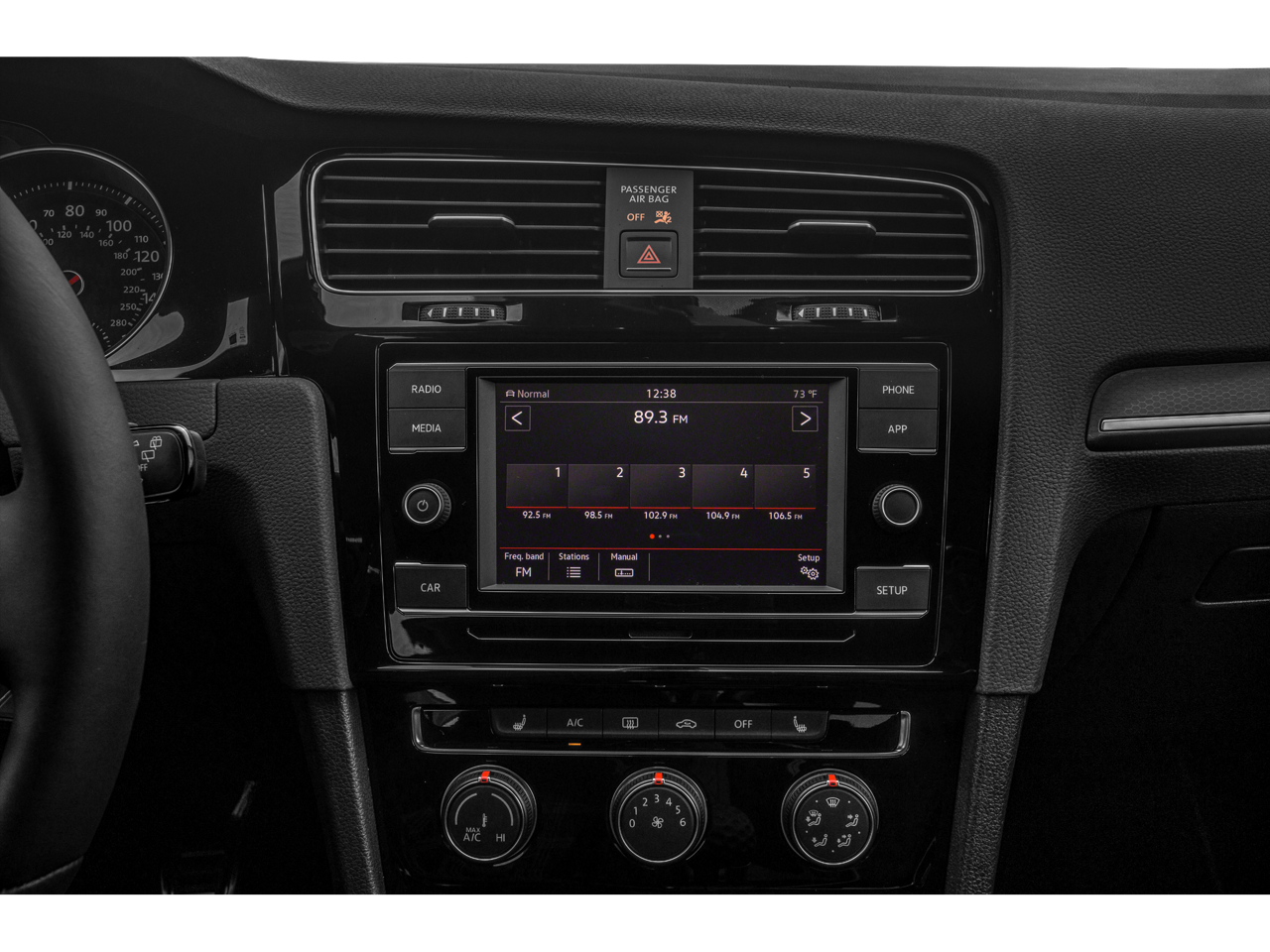 Below is all the standard equipment 4-Wheel Disc Brakes, 9 Speakers, ABS brakes, Active Blind Spot Monitor, Adaptive suspension, Air Conditioning, Alloy wheels, AM/FM radio: SiriusXM, Anti-whiplash front head restraints, Auto High-beam Headlights, Auto-dimming Rear-View mirror, Automatic temperature control, Brake assist, Bumpers: body-color, CD player, Compass, Delay-off headlights, Driver door bin, Driver vanity mirror, Dual front impact airbags, Dual front side impact airbags, Electronic Stability Control, Emergency communication system: VW Car-Net services (capabilities require enrollment or subscription), Exterior Parking Camera Rear, First Aid Kit, Forward collision: FCW w/Autonomous Emergency Braking mitigation, Four wheel independent suspension, Frameless Auto-Dimming Rearview Mirror (GRV), Front anti-roll bar, Front Bucket Seats, Front Center Armrest, Front dual zone A/C, Front fog lights, Front reading lights, Fully automatic headlights, Heated door mirrors, Heated front seats, Heated Front Top Sport Seats, Illuminated entry, Lane Departure Warning System, Leather Seating Surfaces, Leather Shift Knob, Low tire pressure warning, Navigation System, Occupant sensing airbag, Outside temperature display, Overhead airbag, Overhead console, Panic alarm, Passenger door bin, Passenger vanity mirror, Power door mirrors, Power driver seat, Power moonroof, Power passenger seat, Power steering, Power windows, Radio data system, Radio: Discover Media w/8 Touchscreen Navigation, Rain sensing wipers, Rear anti-roll bar, Rear reading lights, Rear seat center armrest, Rear window defroster, Rear window wiper, Remote keyless entry, Roadside Assistance Kit, Rubber Mats Kit, Speed control, Speed-sensing steering, Speed-Sensitive Wipers, Split folding rear seat, Spoiler, Sport steering wheel, Steering wheel mounted audio controls, Tachometer, Telescoping steering wheel, Tilt steering wheel, Traction control, Trip computer, Turn signal indicator mirrors, Variably intermittent wipers, VW App-Connect (w/Apple CarPlay, Android Auto & MirrorLink), and Wheels: 18 5-Spoke 2-Tone Machined Alloy.