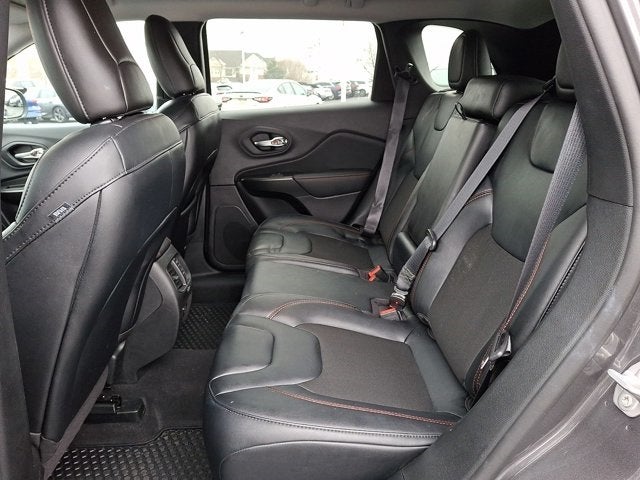 Below is all the standard equipment Comfort/Convenience Group (Auto-Dimming Rear-View Mirror, Hands-Free Power Liftgate, Security Alarm, and Universal Garage Door Opener), Quick Order Package 27E, FCA US LLC Certified Pre-Owned Certified, Wheels: 17 x 7.5 Painted Diamond Cut Aluminum, 3.517 Final Drive Ratio, 4-Wheel Disc Brakes, 4G LTE Wi-Fi Hot Spot, 6 Speakers, 8.4 Touchscreen Display, ABS brakes, Air Conditioning, Alloy wheels, AM/FM radio: SiriusXM, Anti-whiplash front head restraints, Apple CarPlay, Apple CarPlay/Android Auto, Automatic temperature control, Brake assist, Cloth/Premium Vinyl Bucket Seats, Compass, Delay-off headlights, Driver door bin, Driver vanity mirror, Dual front impact airbags, Dual front side impact airbags, Electronic Stability Control, For Details, Visit DriveUconnect.com, For More Info, Call 800-643-2112, Four wheel independent suspension, Front anti-roll bar, Front Bucket Seats, Front Center Armrest, Front dual zone A/C, Front fog lights, Front License Plate Bracket, Front reading lights, Fully automatic headlights, Google Android Auto, GPS Antenna Input, Heated door mirrors, Heated front seats, Heated steering wheel, Illuminated entry, K-Black Door Trim Panel Appliques, K-Black Interior Accents, Knee airbag, Leather Shift Knob, Low tire pressure warning, Occupant sensing airbag, Off Road Suspension, Outside temperature display, Overhead airbag, Overhead console, Panic alarm, ParkView Rear Back-Up Camera, Passenger door bin, Passenger vanity mirror, Power door mirrors, Power driver seat, Power steering, Power windows, Radio data system, Radio: Uconnect 4 w/8.4 Display, Rain sensing wipers, Rear anti-roll bar, Rear reading lights, Rear seat center armrest, Rear side impact airbag, Rear window defroster, Rear window wiper, Remote keyless entry, Roof rack: rails only, SiriusXM Radio Service, SiriusXM Satellite Radio, Speed control, Speed-sensing steering, Split folding rear seat, Spoiler, Steering wheel mounted audio controls, Tachometer, Telescoping steering wheel, Tilt steering wheel, Traction control, Trip computer, Turn signal indicator mirrors, USB Host Flip, Variably intermittent wipers, and VoltmeteR.