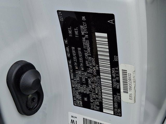 Below is all the standard equipment 3.329 Axle Ratio, 3rd row seats: split-bench, 4-Wheel Disc Brakes, 6 Speakers, ABS brakes, Air Conditioning, Alloy wheels, AM/FM radio: SiriusXM, Apple CarPlay/Android Auto, Auto High-beam Headlights, Auto-dimming Rear-View mirror, Automatic temperature control, Brake assist, Bumpers: body-color, Delay-off headlights, Driver door bin, Driver vanity mirror, Dual front impact airbags, Dual front side impact airbags, Electronic Stability Control, Emergency communication system: Safety Connect (up to 10-year trial subscription), Exterior Parking Camera Rear, Four wheel independent suspension, Front anti-roll bar, Front Bucket Seats, Front Center Armrest, Front dual zone A/C, Front fog lights, Front reading lights, Fully automatic headlights, Garage door transmitter: HomeLink, Heated door mirrors, Heated Front Bucket Seats, Heated front seats, Illuminated entry, Knee airbag, Leather Shift Knob, Leather steering wheel, Low tire pressure warning, Occupant sensing airbag, Outside temperature display, Overhead airbag, Overhead console, Panic alarm, Passenger door bin, Passenger vanity mirror, Power door mirrors, Power driver seat, Power Liftgate, Power moonroof, Power passenger seat, Power steering, Power windows, Radio: 8 Toyota Audio Multimedia, Rear air conditioning, Rear anti-roll bar, Rear reading lights, Rear window defroster, Rear window wiper, Reclining 3rd row seat, Remote keyless entry, Security system, SofTex Seat Trim, Speed control, Speed-sensing steering, Split folding rear seat, Spoiler, Steering wheel mounted audio controls, Tachometer, Telescoping steering wheel, Tilt steering wheel, Traction control, Trip computer, Turn signal indicator mirrors, Variably intermittent wipers, and Wheels: 18 Machined-Finish Alloy.