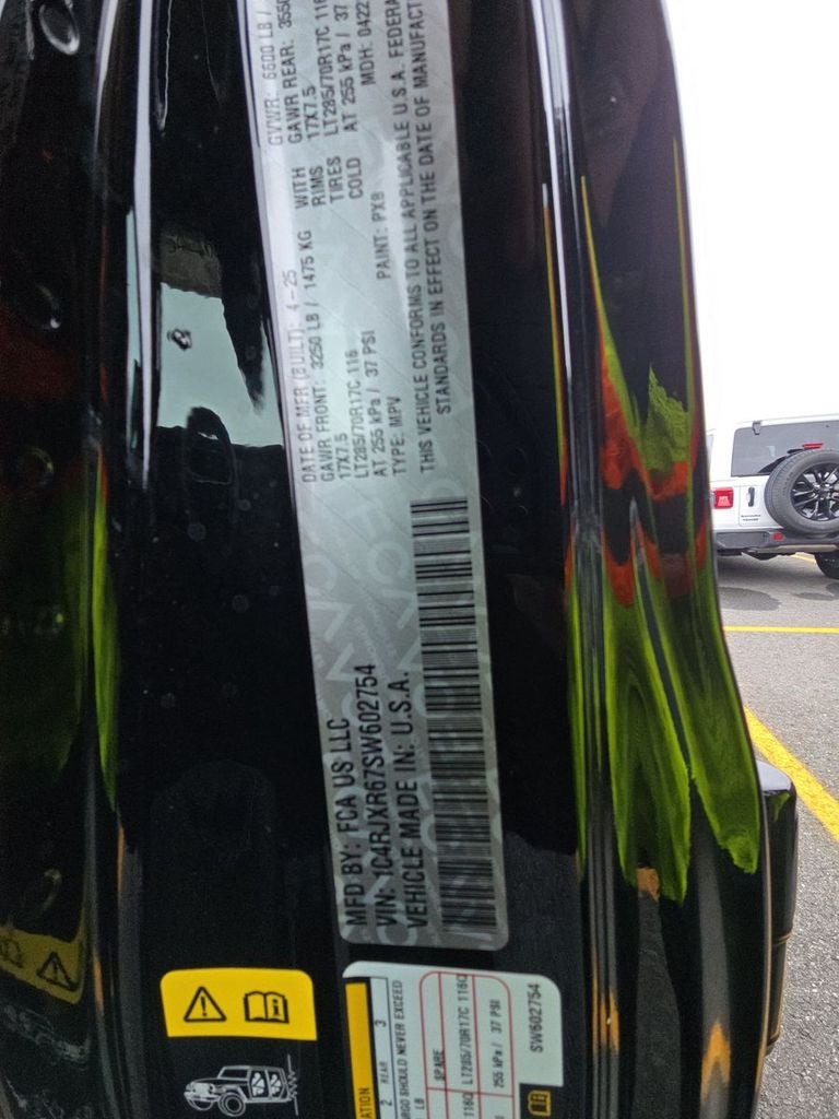 Below is all the standard equipment Convenience Group (Heated Front Seats, Heated Steering Wheel, Remote Start System, and Universal Garage Door Opener), Quick Order Package 29V Rubicon 4xe, Safety Group (Auto High Beam Headlamp Control, Blind Spot & Cross Path Detection, and ParkSense Rear Park Assist System), 2.0L I4 DOHC, Black 3-Piece Hard Top, Freedom Panel Storage Bag, Rear Window Defroster, Rear Window Wiper/Washer, 4-Wheel Disc Brakes, 4.10 Rear Axle Ratio, 4G LTE Wi-Fi Hot Spot, 7 & 4 Pin Wiring Harness, 8 Speakers, ABS brakes, Air Conditioning, Alloy wheels, AM/FM radio: SiriusXM, Apple CarPlay, Apple CarPlay/Android Auto, Automatic temperature control, Brake assist, Compass, Connectivity - US/Canada, Delay-off headlights, Driver door bin, Driver vanity mirror, Dual front impact airbags, Dual front side impact airbags, Electronic Stability Control, Emergency communication system: Jeep Connect, Front anti-roll bar, Front Bucket Seats, Front Center Armrest w/Storage, Front dual zone A/C, Front fog lights, Front License Plate Bracket (DISC), Front reading lights, Fully automatic headlights, Google Android Auto, Heated door mirrors, Illuminated entry, Integrated roll-over protection, Integrated Voice Command w/Bluetooth®, Low tire pressure warning, Occupant sensing airbag, Outside temperature display, Overhead airbag, Panic alarm, ParkView Rear Back-Up Camera, Passenger door bin, Passenger vanity mirror, Performance Suspension, Power door mirrors, Power steering, Power windows, Radio data system, Radio: Uconnect 5 w/12.3 Display, Rear anti-roll bar, Rear reading lights, Remote keyless entry, Security system, Speed control, Split folding rear seat, Steering wheel mounted audio controls, Sustainable Premium Cloth Seats, Tachometer, Telescoping steering wheel, Tilt steering wheel, Traction control, Trip computer, Variably intermittent wipers, Voltmeter, and Wheels: 17 x 7.5 Machined w/Black Pockets.