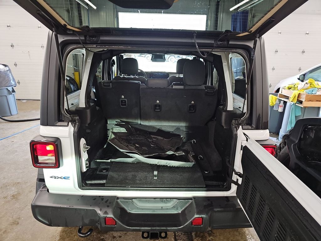 Below is all the standard equipment Convenience Group (2-Door Passive Entry, Front Door Locks, Air Conditioning w/Auto Temperature Control, Air Filtering, Emergency/Assistance Call, Heated Front Seats, Heated Steering Wheel, Remote Start System, and Universal Garage Door Opener), Quick Order Package 29W Willys 4xe (4-Wheel Drive Swing Gate Decal, 4.10 Rear Axle Ratio, 7 & 4 Pin Wiring Harness, 97 MPH Vehicle Max Speed Calibration, Auxiliary Switches, Black Grille, Class II Receiver Hitch, Conventional Differential Front Axle, E-Locker Rear Axle, Front LED Fog Lamps, LED Premium Reflector Headlamps, Molded in Color Rubicon Highline Flare, MOPAR All-Weather Floor Mats, Off-Road Plus Mode, Wheels: 17 x 7.5 Painted Black, Willy's Suspension, and Willys 4xe Hood Decal), 2.0L I4 DOHC, 4-Wheel Disc Brakes, 8 Speakers, ABS brakes, Air Conditioning, Alloy wheels, AM/FM radio: SiriusXM, Apple CarPlay/Android Auto, Black 3-Piece Hard Top, Brake assist, Cloth Low-Back Bucket Seats, Compass, Delay-off headlights, Driver door bin, Driver vanity mirror, Dual front impact airbags, Dual front side impact airbags, Electronic Stability Control, Freedom Panel Storage Bag, Front anti-roll bar, Front Bucket Seats, Front Center Armrest w/Storage, Front fog lights, Front License Plate Bracket (DISC), Front reading lights, Fully automatic headlights, Heated door mirrors, Illuminated entry, Integrated roll-over protection, Low tire pressure warning, Occupant sensing airbag, Outside temperature display, Overhead airbag, Panic alarm, ParkView Rear Back-Up Camera, Passenger door bin, Passenger vanity mirror, Power door mirrors, Power steering, Power windows, Radio data system, Radio: Uconnect 5 w/12.3 Display, Rear anti-roll bar, Rear reading lights, Rear Window Defroster, Rear Window Wiper/Washer, Remote keyless entry, Security system, Speed control, Split folding rear seat, Sport Suspension, Steering wheel mounted audio controls, Tachometer, Telescoping steering wheel, Tilt steering wheel, Traction control, Trip computer, Variably intermittent wipers, Voltmeter, and Wheels: 20 x 8 Machined/Painted Gray.